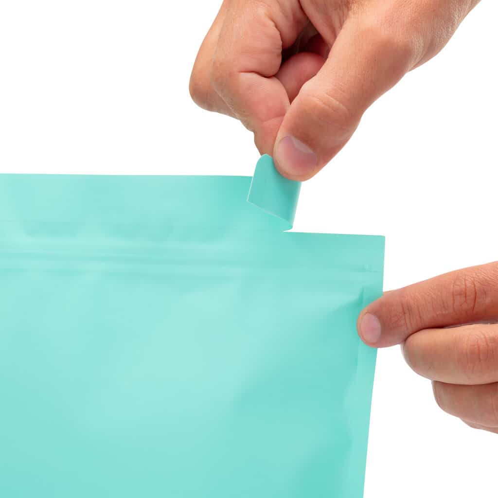 This turquoise doypack with a resealable zip closure combines a refreshing, modern aesthetic with recyclable monoplastic construction. It delivers both striking shelf presence and dependable protection — ideal for everything from wellness teas and healthy snacks to premium artisan blends.